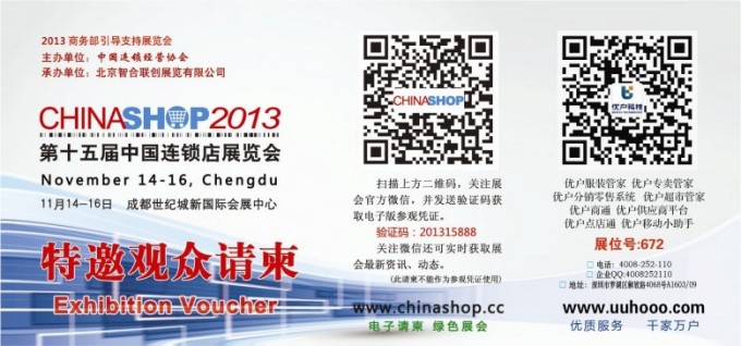 邀請函尊敬的合作伙伴:優戶科技誠邀您參加第十六屆中國連鎖店展覽會 ! 此次展會,我們將以O2O場景模擬化的形式搭建展會現場,通過技術手段,帶您體驗真正的O2O解決方案,讓企業落實O2O不再是一句空話! 打通數據壁壘--與進銷存系統、收銀系統對接,實現線上線下數據打通,即時共享。O2O平臺--PC商城、微信商城、APP,三個流量入口一網打盡!微信支付--通過微信掃碼購,讓支付變得簡單!微...